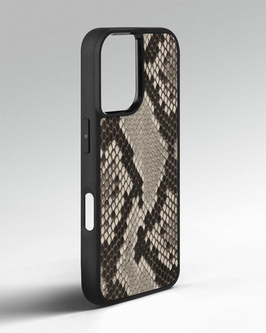 Чохол із чорно-білої шкіри пітона з дрібними лусочками для iPhone 16 Plus