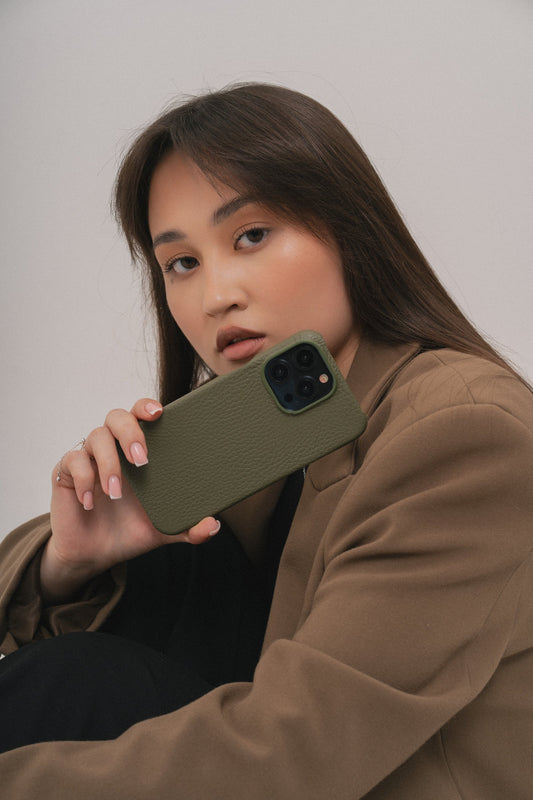 Оливковий шкіряний чохол для iPhone 15 Pro