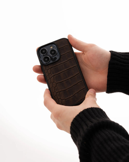 Чохол із темно-коричневого тиснення під крокодила на телячій шкірі для iPhone 15 Plus
