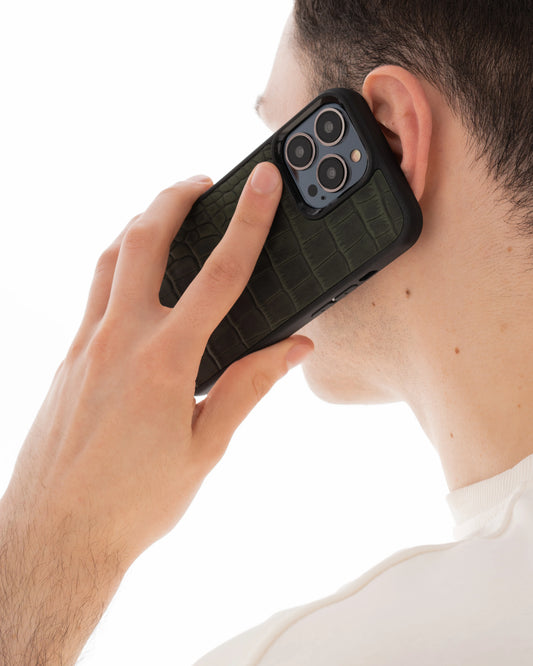 Чохол із темно-зеленого тиснення під крокодила на телячій шкірі для iPhone 15