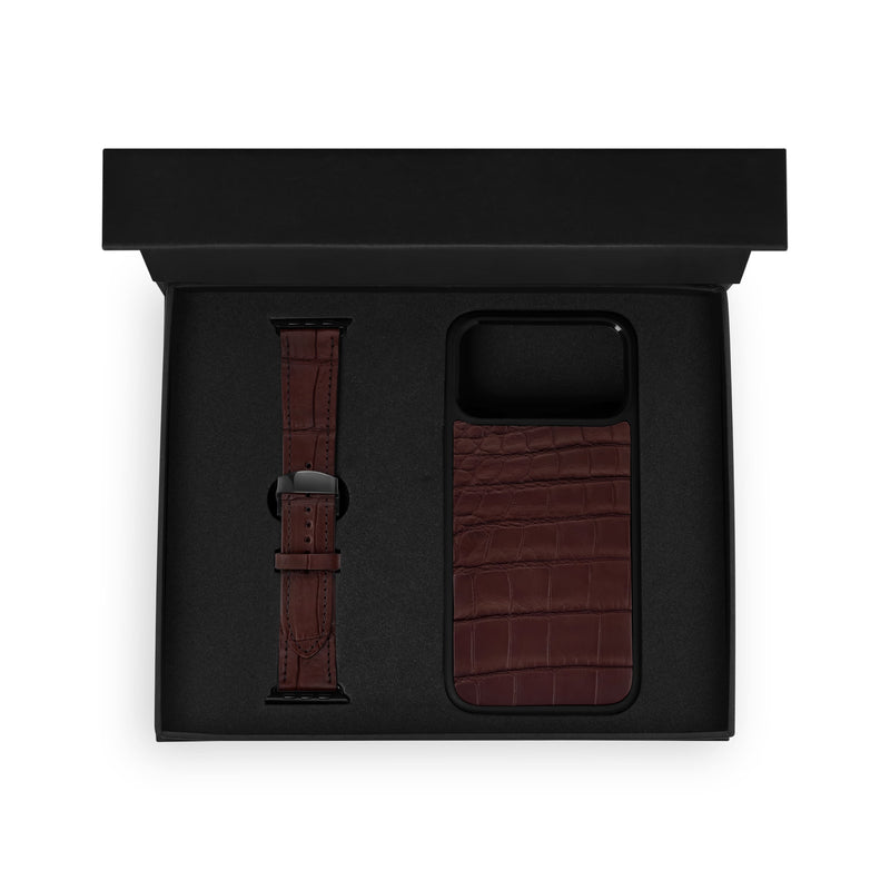 Набір з коричневої шкіри крокодила, чохол для iPhone та ремінець Apple Watch