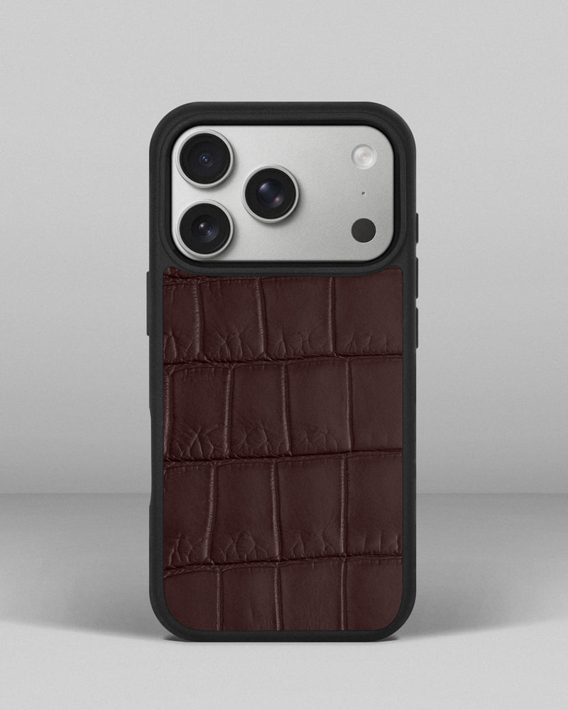 Чохол із темно-коричневої шкіри крокодила для iPhone 17 Pro забезпечить надійний захист вашому смартфону від подряпин, сколів та ударів, а також збереже його від зносу і забруднень. Він має плавні кути і дбайливо зроблений, він надійно кріпиться на ваш iPhone 16 Pro і не займає багато місця в кишені або сумці.