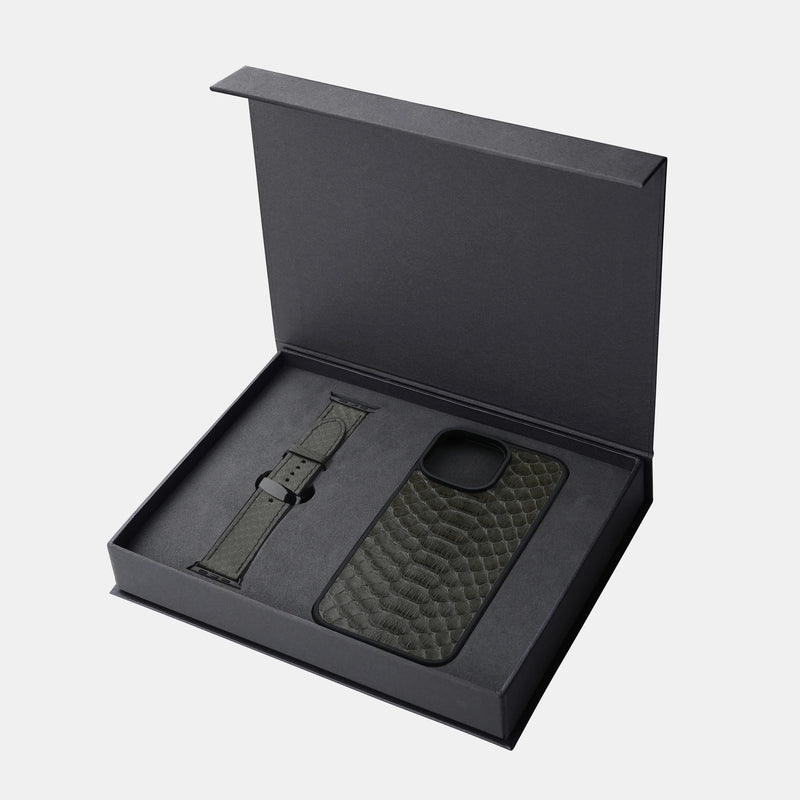 Набір з зеленої шкіри пітона з широкими лусочками, чохол для iPhone і ремінець для Apple Watch